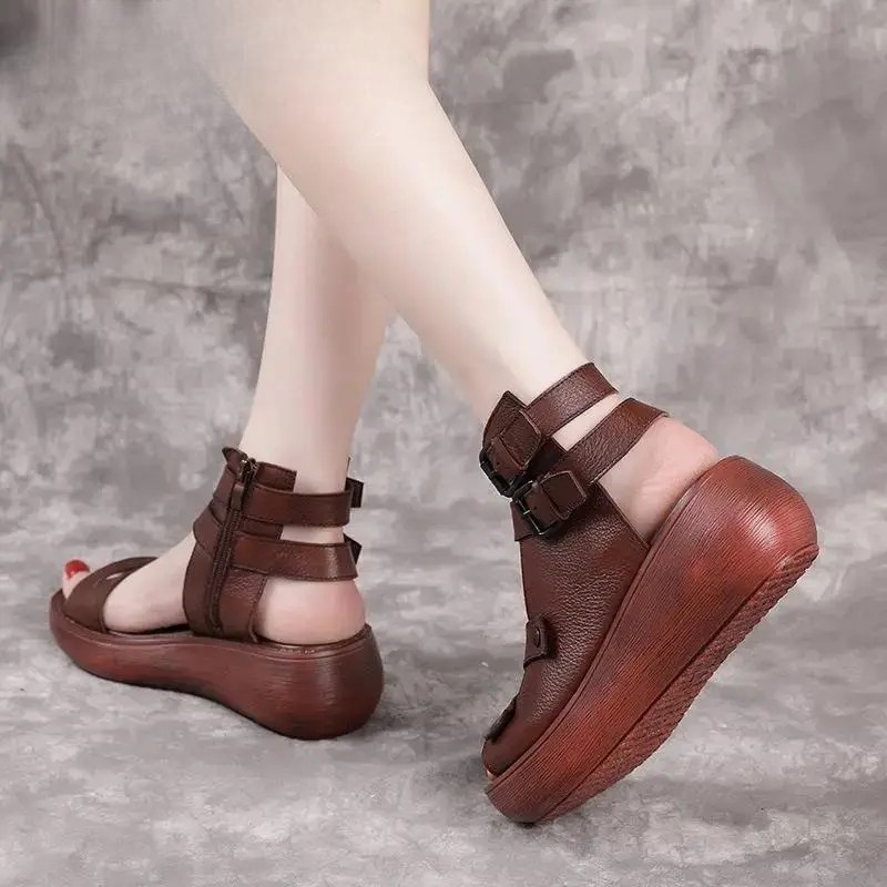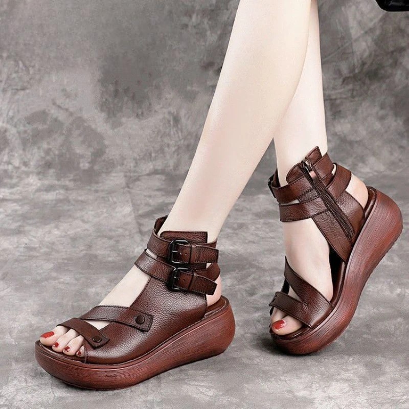 Sandales compensées gladiateur rétro en cuir pour femmes – élégance vintage, confort et allure affirmée